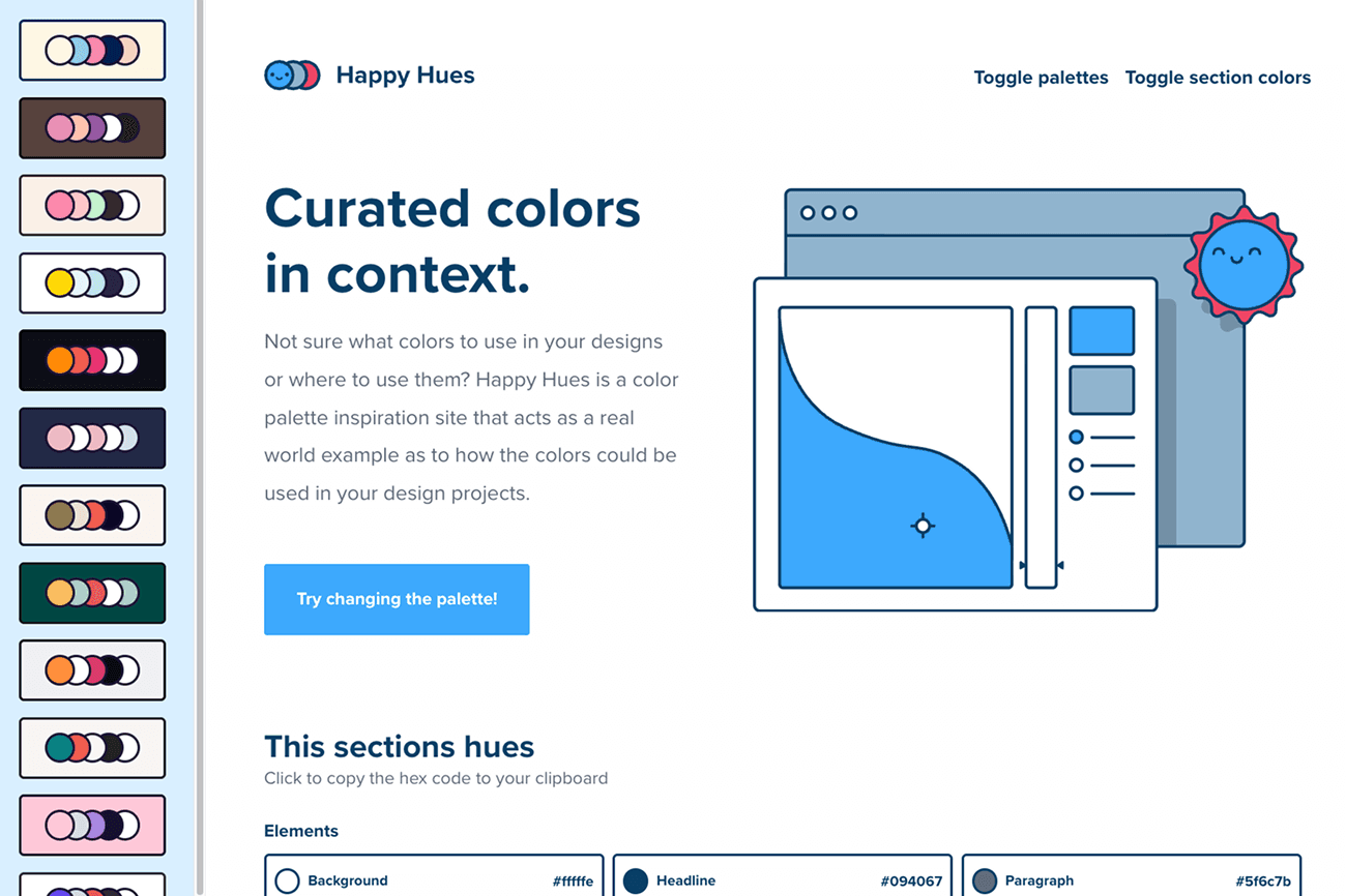 Happy Hues is a small, one-person project where you choose a color palette from the sidebar, and the whole page updates to show how those colors look in a real user interface: headers, text, buttons, cards, and more. Seeing a palette in context makes choosing colors much easier. There’s no signup, account, or newsletter.